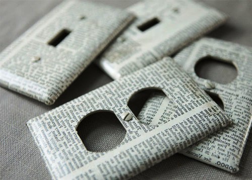 Вырежьте из салфетки или газеты прямоугольник на сантиметр больше периметра выключателя (либо же небольшие прямоугольники точно под размер клавиш выключателя). Нанесите клей для декупажа на салфетку и оклеиваемую поверхность выключателя. Приложите бумагу и хорошо разгладьте ее. Если вы оклеиваете корпус, то заворачивайте бумагу на обратную стоону пластика и приклеивайте там.