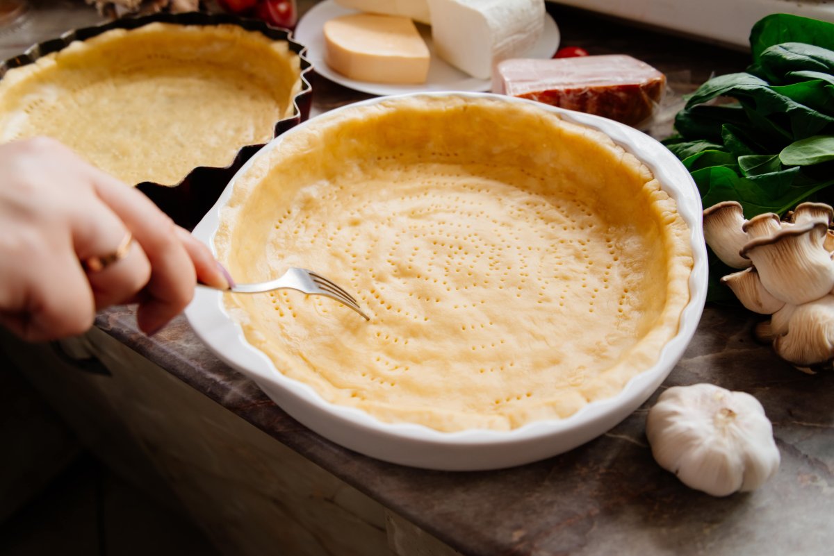 Равномерно выложите картофельное тесто по форме для тарта, формируя бортики.