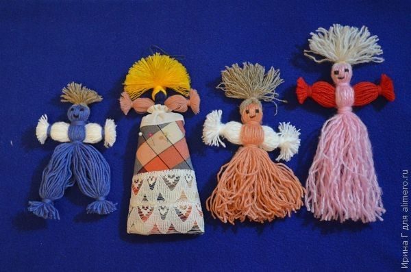 Предлагаю вашему вниманию куклу из ниток, или из пряжи. Делается такая кукла быстро, особых навыков в рукоделии ее изготовление не требует. Я, как видите, сделала целую компанию.