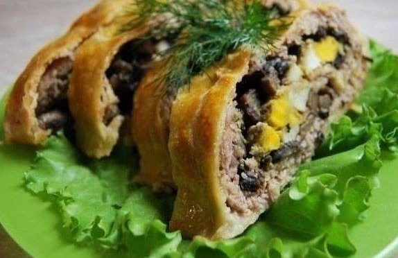 Мясной рулет с грибами в слоеном тесте