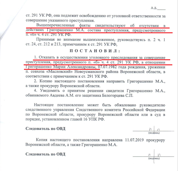 К слову, сказать, я освобождена от уголовной ответственности, так как заявила о коррупции в органы, имеющие полномочия пресечь преступление. Есть соответствующее постановление.