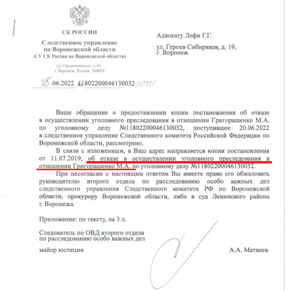 Уголовное дело в отношении А. (Авдеева) до настоящего времени расследуется формально. Также установлено, что отец А. (Авдеева) является действующим судьей коллегии по уголовным делам Воронежского областного суда.