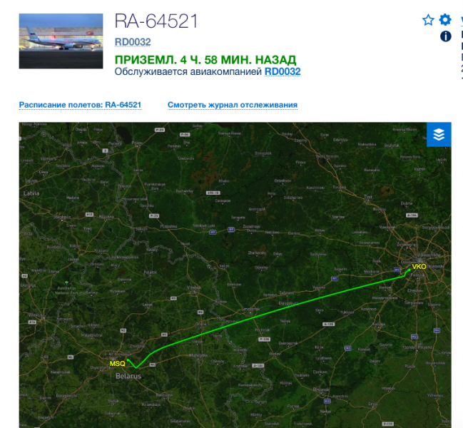Самолет Ту-214 специального летного отряда «Россия» с регистрационным номером RA-64521 24 мая летал из Москвы в Минск и обратно. Информацию «МБХ медиа» обнаружило в сервисе Flightaware.